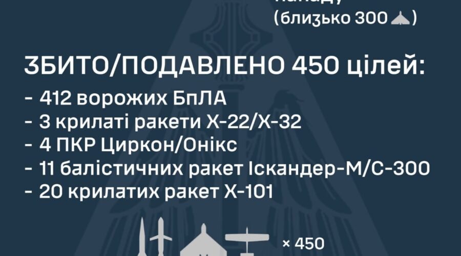 За попередніми даними, станом на 09:30, протиповітряною обороною збито/подавлено 450 цілей – 38 ракет та 412 безпілотників різних типів:
