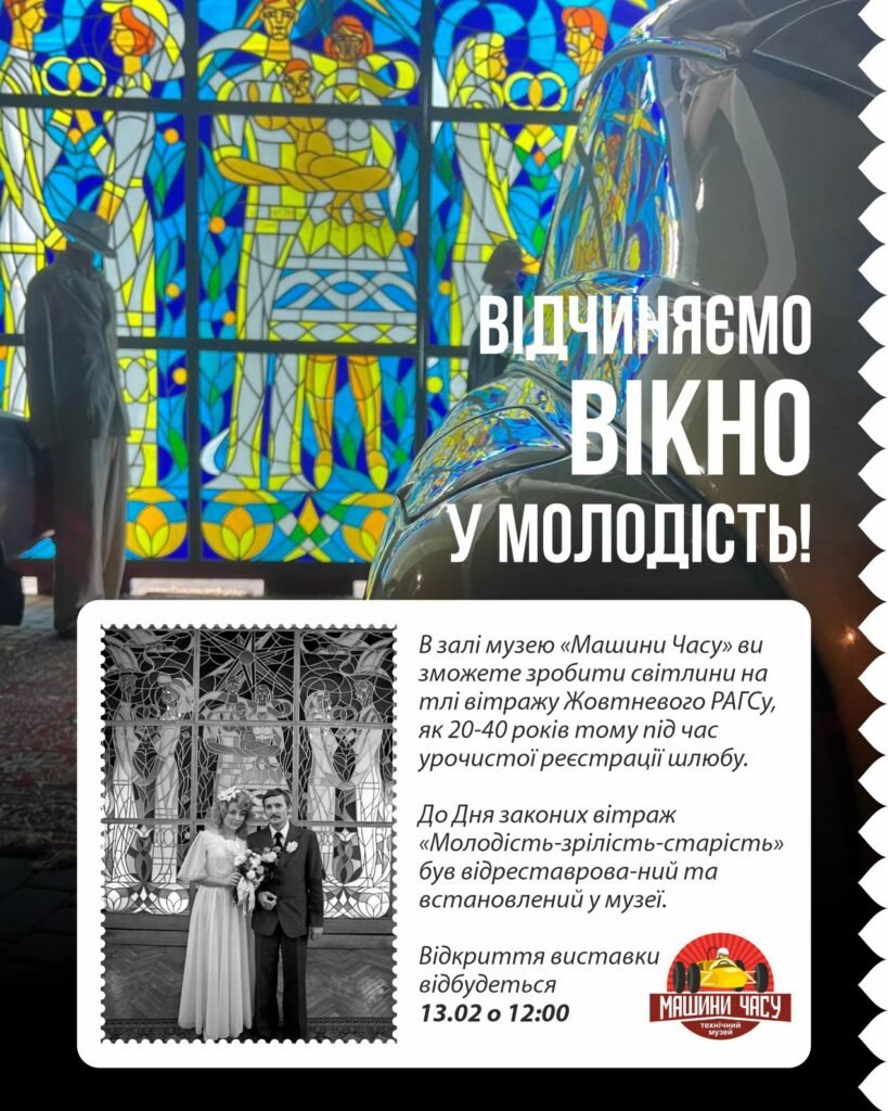 Зазначається, що неезабаром в залі музею “Машини Часу” ви зможете зробити світлини на тлі вітражу Жовтневого РАГСу, як 20-40 років тому під час урочистої реєстрації шлюбу. Також ви можете принести свої фотографії з церемонії одруження, вони будуть розміщені в музеї на час роботи виставки.