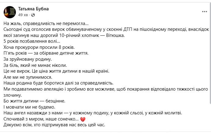 Про це на своїй фейсбук-сторінці повідомила бабуся загиблого хлопчика Тетяна Бубна, передає Хронікерс.