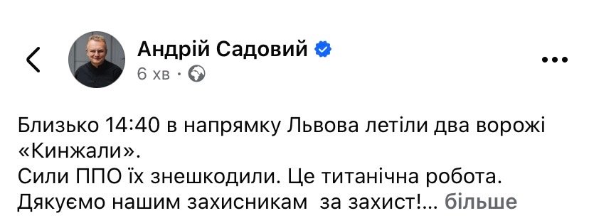«Близько 14:40 в напрямку Львова летіли два ворожі «Кинжали». Сили ППО їх знешкодили. Це титанічна робота. Дякуємо нашим захисникам за захист! Станом на цю хвилину інформації про руйнування чи постраждалих немає. Міські служби обстежують територію громади. Якщо маєте важливу інформацію — повідомляйте на Гарячу лінію міста», – написав Андрій Садовий.