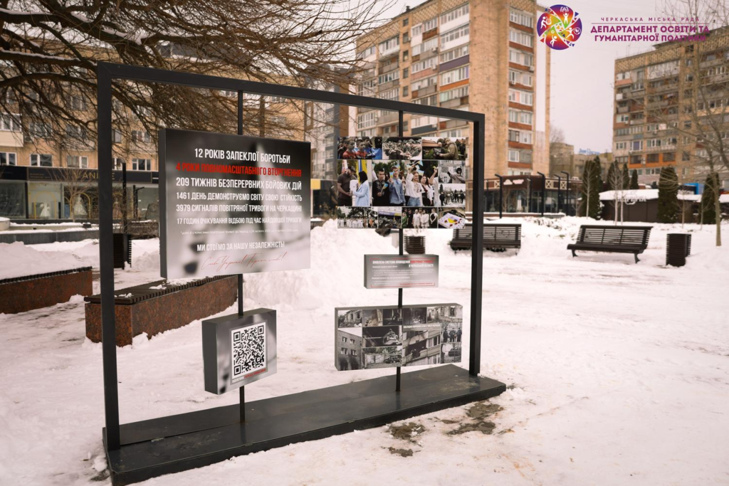 Департаменту освіти та гуманітарної політики презентував оновлену інформаційну інсталяцію «Найдовший лютий у житті», яка містить статистику сигналів «Повітряна тривога» на Черкащині, відео «Хроніка війни», фотосвідчення та інші матеріали про події повномасштабного вторгнення. Експозиція розташована у сквері «Юність».