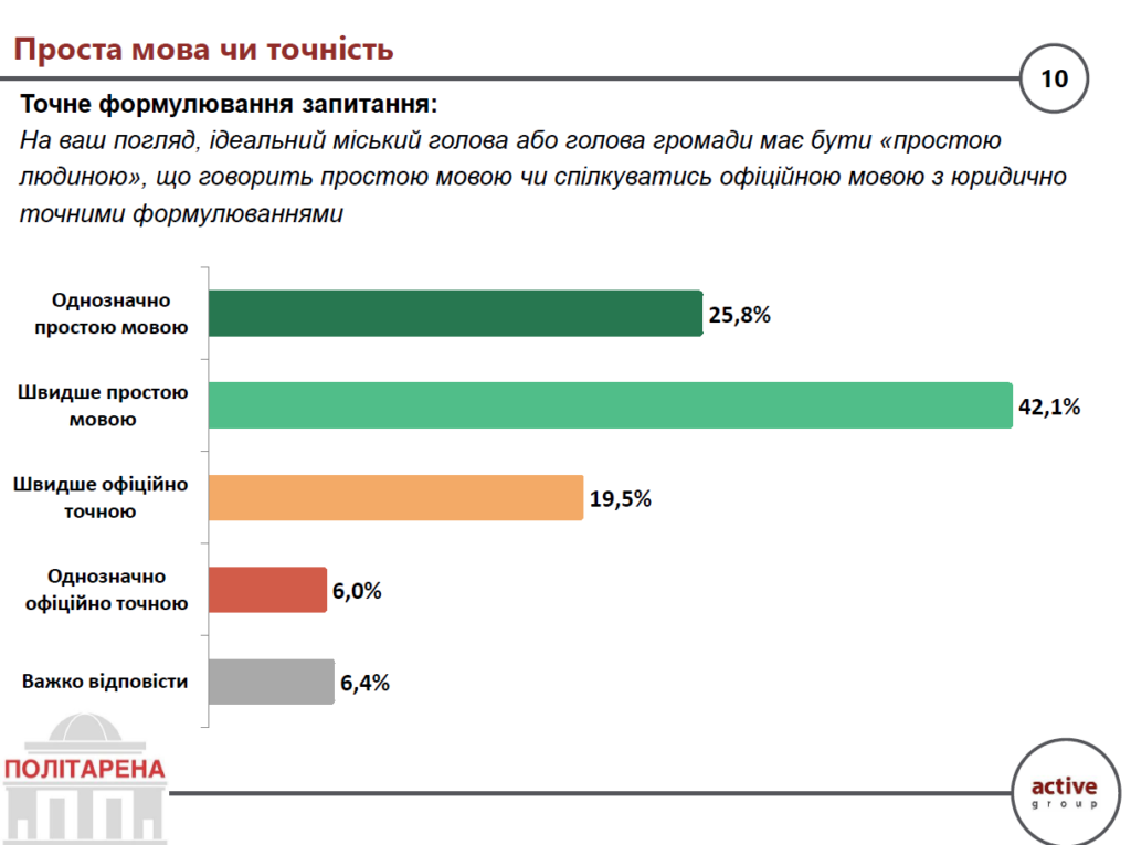 Зокрема, 67,9% опитаних очікують, що ідеальний мер буде говорити простою мовою, тоді як лише 25,5% обирають офіційно-точний стиль.