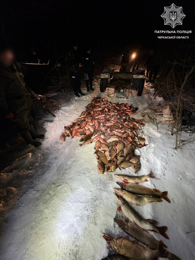Під час огляду трицикла інспектори виявили рибальський бур та п’ять мішків зі свіжовиловленою рибою: 155 лящів, 57 карасів, 14 коропів, 9 щук, 11 товстолобів, а також плітку та плоскирку.