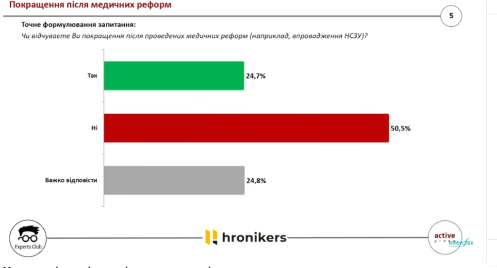 Респондентам також поставили питання, чи задоволені вони запровадженими державою медичними реформами? Тут 50,5% опитуваних сказали, що ні. Задоволені 24,7% опитуваних, а інші не змогли однозначно відповісти на це питання.