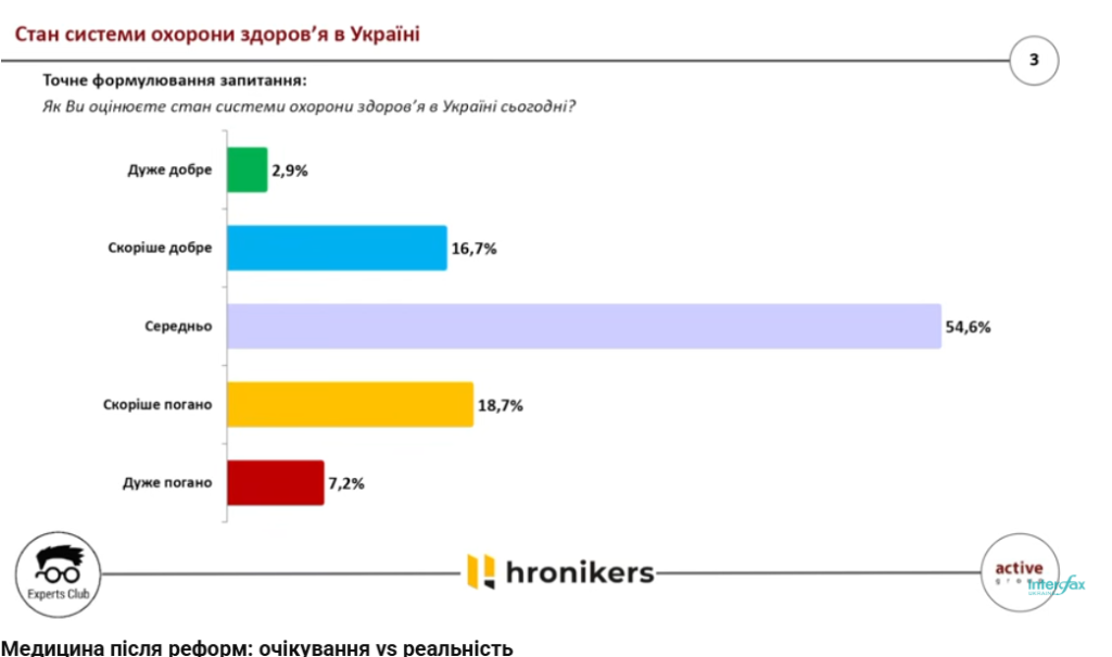 Згідно даних, отриманих під час опитування, дуже добре медичну сферу оцінили тільки 3% опитаних, скоріше добре – ще 16,7%, скоріше негативно 18,7% і дуже погано 7,2%. А 54,6% вважають як раз, що рівень надання медичних послуг посередній.