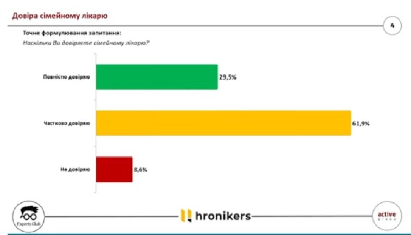 При цьому, сімейним лікарям повністю довіряють 29,5% опитаних, частково довіряють 61,9%. Не довіряють лише 8,6%.