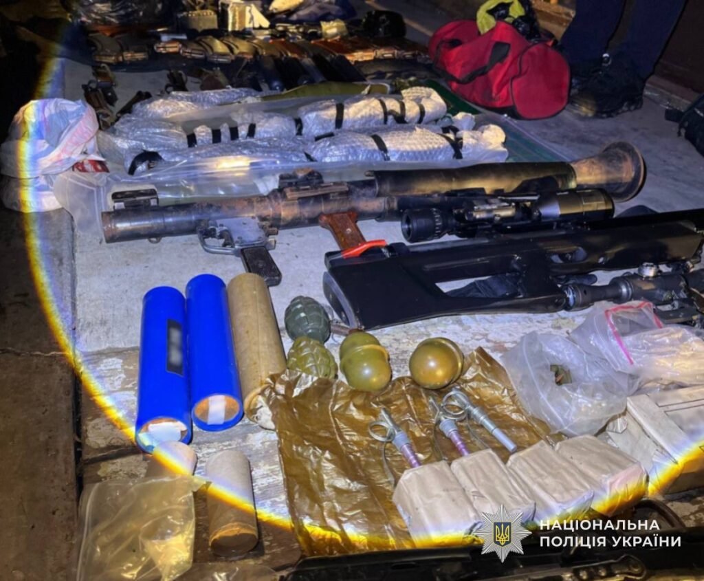 «У результаті поліції вдалося вилучити ручний протитанковий гранатомет із гранатометними пострілами та пороховими зарядами до них, автомати АК-74, АКМС та пістолет-кулемет Шпагіна, чотири бойові гранати із запалами, дві гвинтівки з оптичними прицілами, два пістолети з магазинами (частина з яких була споряджена набоями), 14 автоматних магазинів, п’ять із яких були споряджені, а також барабанний магазин, шість глушників, комплектуючі до автоматичної зброї, штик-ніж, шість ножів, з яких два — багнети, димові шашки та вибухові пакети, а також понад 1300 набоїв різного калібру. Крім цього, вилучено автомобіль «Audi A6», мотоцикл та квадроцикл, що належать фігурантові», — кажуть у поліції.