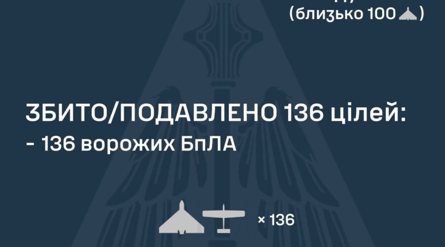 За попередніми даними, станом на 08:00, протиповітряною обороною збито/подавлено 136 ворожих БпЛА.