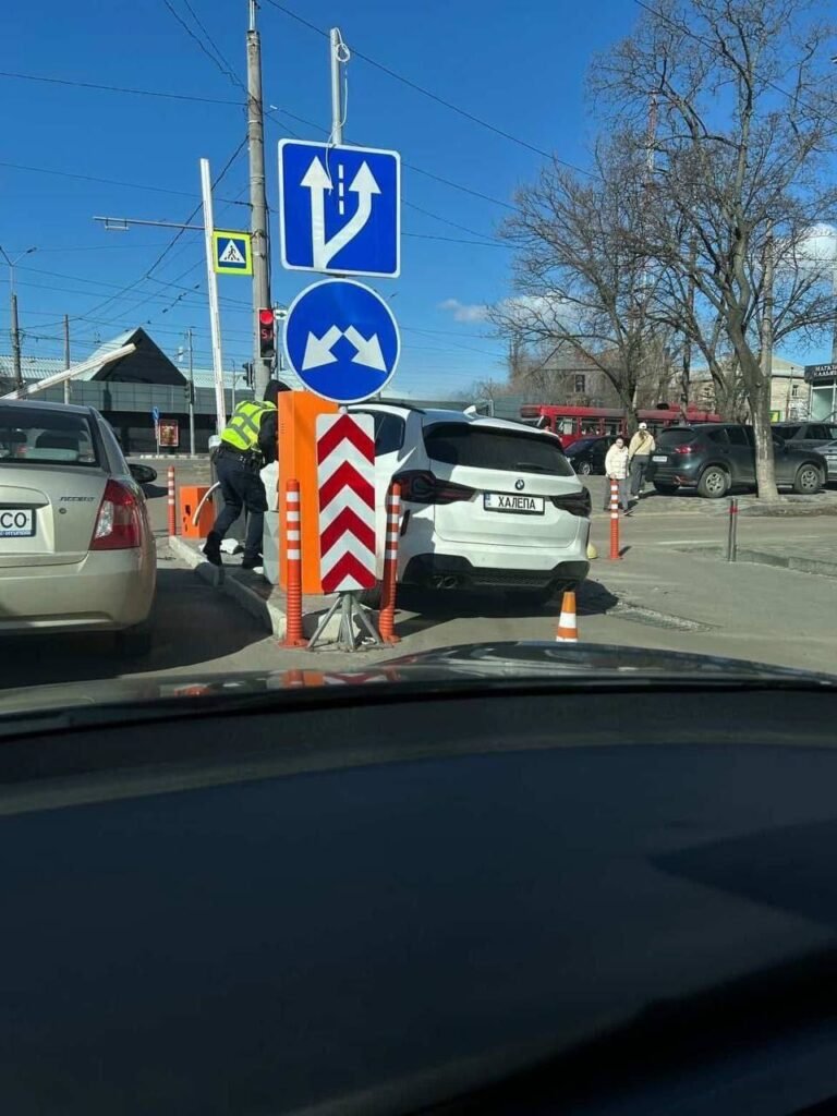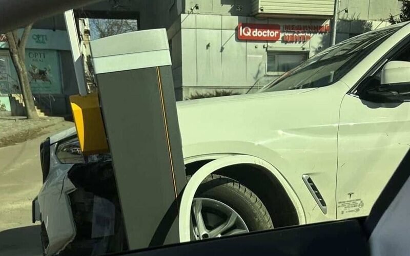 На проспекті Науки біля ТРЦ Neo Plaza BMW з номерами «ХАЛЕПА» в’їхав прямо в тумбу шлагбаума на парковці, пошкодивши і саме обладнання, і свій автомобіль.
