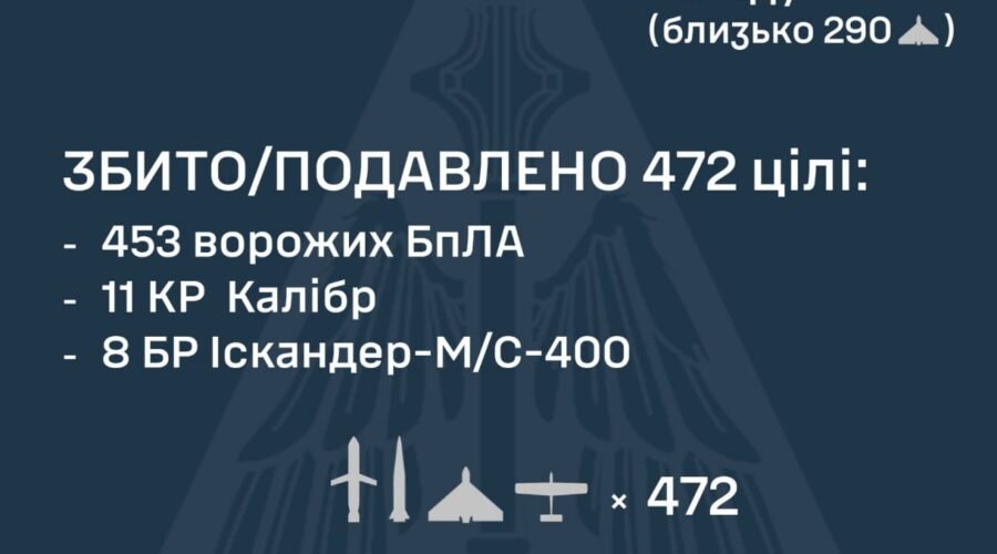 За попередніми даними, станом на 09:00, протиповітряною обороною збито/подавлено 472 цілі – 19 ракет та 453 безпілотники різних типів:
