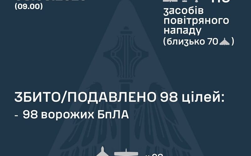“За попередніми даними, станом на 09:00, протиповітряною обороною збито/подавлено 98 ворожих БпЛА типу Shahed, Гербера і дронів інших типів на півночі, півдні та сході країни”, – йдеться у повідомленні.