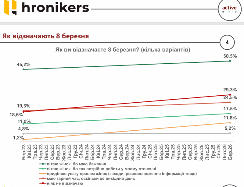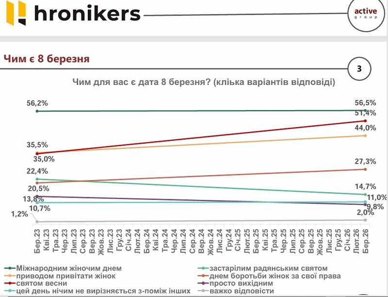 З березня 2023 року по березень 2026 року громадська думка щодо святкування 8 березня в Україні суттєво змінилася. Про це свідчать результати соціологічного дослідження, проведеного виданням «Хронікерс» спільно з компанією «Active Group» 7 березня 2026 року
