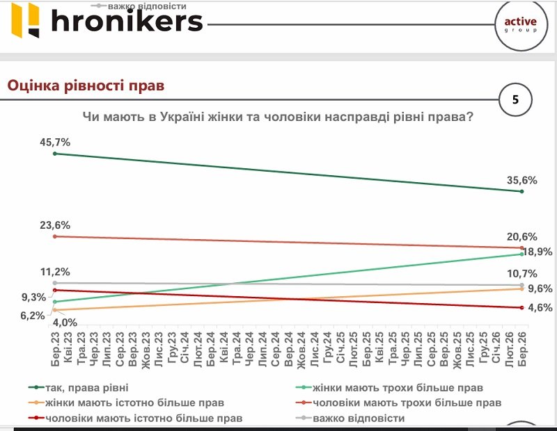 Змушує серйозно замислитися думка українців, чи справді в Україні чоловіки та жінки мають рівні права. За три роки частка тих, хто вважає, що це справді так, зменшилася з 45,7% до 35,6%. Кількість тих, хто вважають, що чоловіки мають значно більше прав, зменшилася з 9,3% до 4,6%. Що трохи більше прав теж зменшиласяз 23,6% до 20,6%. А от кількість тих, хто переконаний, що у жінок значно більше прав, ніж у чоловіків, навпаки зросла – з 4% до 9,6%. Що трохи більше прав у жінок, ніж у чоловіків теж є зростання – з 9,3% до 18,9%.
