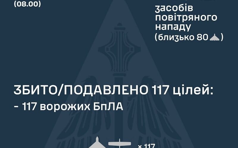“За попередніми даними, станом на 08:00, протиповітряною обороною збито/подавлено 117 ворожих БпЛА”, – йдеться у повідомленні.