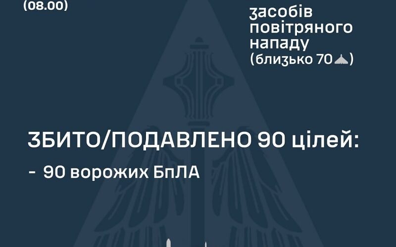 “За попередніми даними, станом на 08:00, протиповітряною обороною збито/подавлено 90 ворожих БпЛА”, – йдеться у повідомленні.