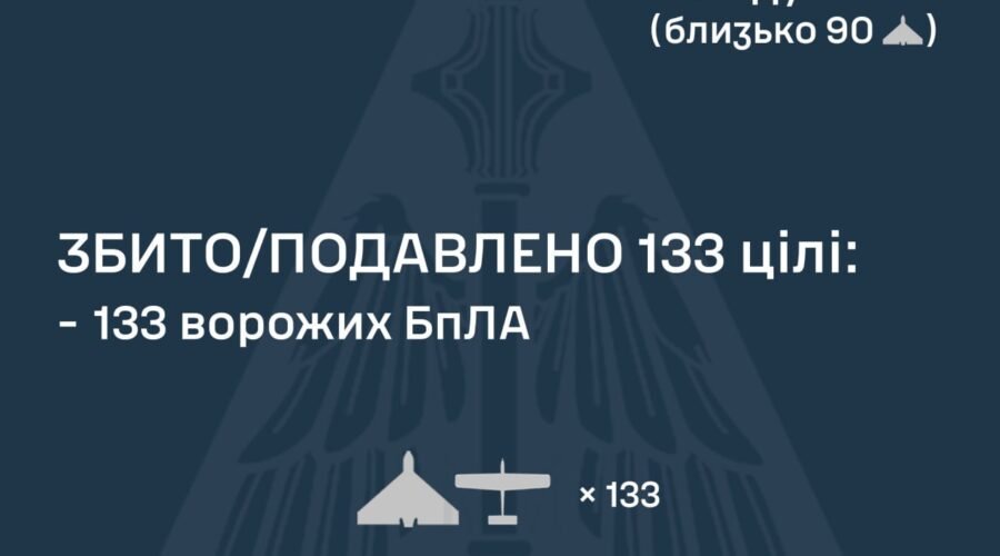 За попередніми даними, станом на 08:00, протиповітряною обороною збито/подавлено 133 ворожих БпЛА.