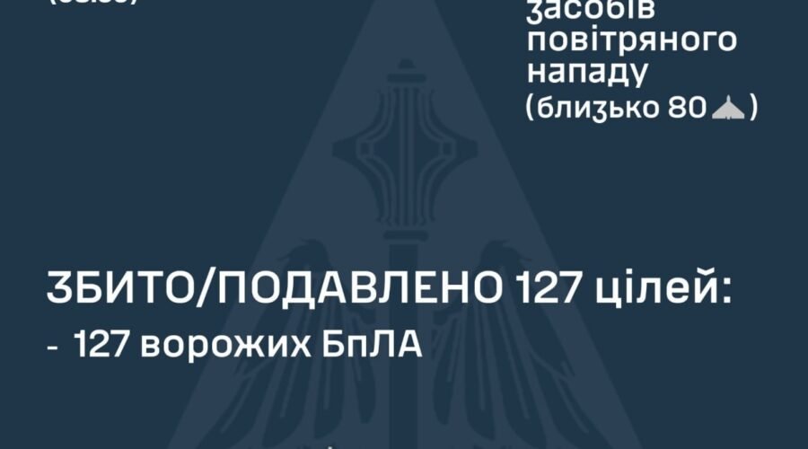 “За попередніми даними, станом на 08:30, протиповітряною обороною збито/подавлено 127 ворожих БпЛА типу Shahed, Гербера, Італмас та дрони інших типів на півночі, півдні та сході країни”, – йдеться у повідомленні.