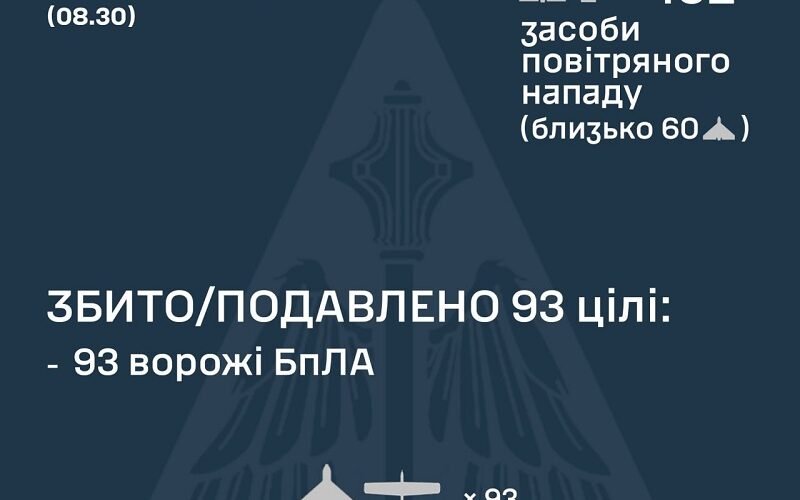 “За попередніми даними, станом на 08:30, протиповітряною обороною збито/подавлено 93 ворожі БпЛА типу Shahed, Гербера, Італмас та безпілотники інших типів на півночі, півдні та сході країни”, – йдеться у повідомленні.
