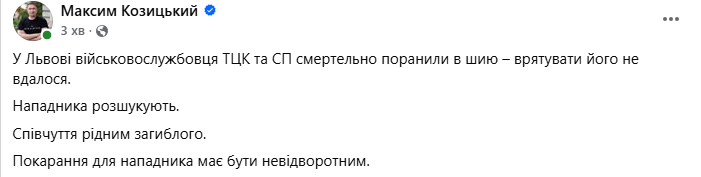 «У Львові військовослужбовця ТЦК та СП смертельно поранили в шию – врятувати його не вдалося. Нападника розшукують. Співчуття рідним загиблого. Покарання для нападника має бути невідворотним», – написав він.