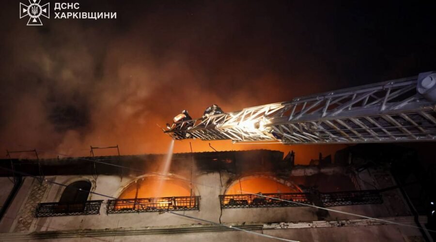 В Основ’янському районі безпілотник влучив у чотирьохповерхову нежитлову будівлю. Виникла пожежа на четвертому поверсі та даху на площі 320 кв. м.