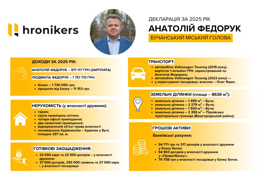 Голова Бучанської громади Анатолій Федорук подав декларацію за 2025 рік у березні 2026-го. У документі зазначені доходи родини, житло, транспорт і кілька земельних ділянок.