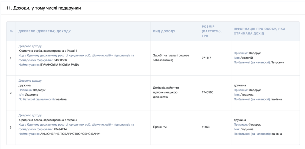 Основним доходом Анатолія Федорука у 2025 році була заробітна плата у Бучанській міській раді — 971 117 грн. Його дружина – Людмила Федорук – отримала 1 740 560 грн унаслідок підприємницької діяльності та ще 11 153 грн як «проценти» від банку Sense.