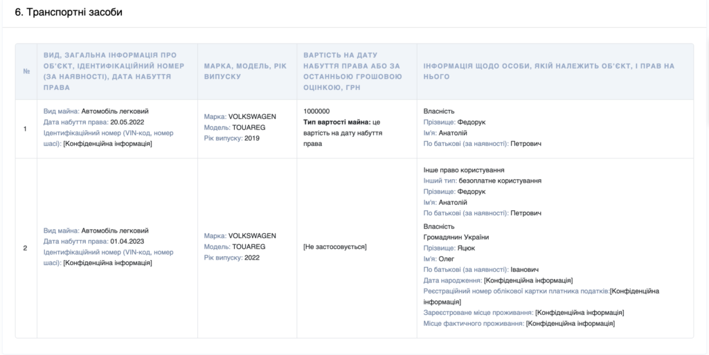 - автомобіль Volkswagen Touareg (2022 року) — у користуванні посадовця, власник – Олег Яцюк.