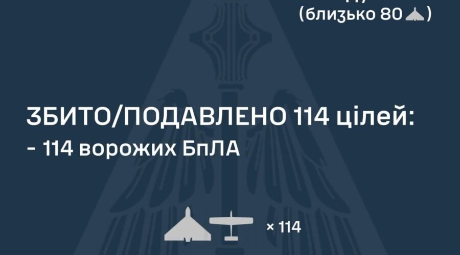 За попередніми даними, станом на 08:00, протиповітряною обороною збито/подавлено 114 ворожих БпЛА на півночі, півдні та сході країни.