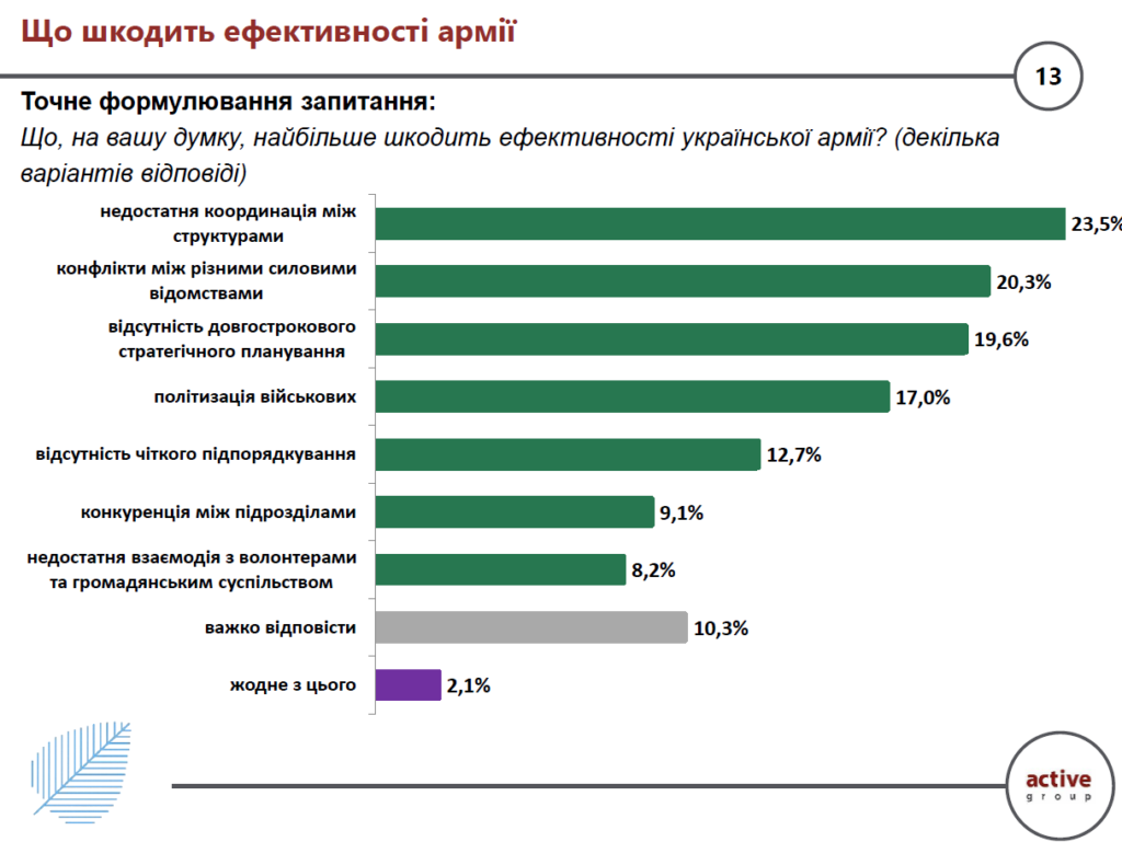 Шкідливою вважають неякісну комунікацію між Генштабом, командуванням і бійцями – 28,9%, погану вертикаль відповідальності за провали й помилки – 28,9%, витік інформації та недотримання режиму тиші – 27,1%, недостатню координацію між структурами – 23,5%, конфлікти між різними силовими відомствами – 20,3%, відсутність довгострокового стратегічного планування – 19,6%, політизацію військових – 17,0%.