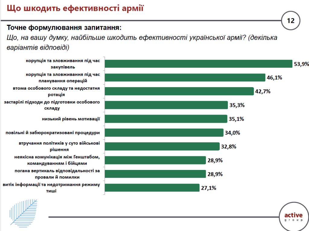 Серед чинників, які, на думку опитаних, найбільше шкодять ефективності української армії, на першому місці корупція та зловживання під час закупівель – 53,9%.Далі респонденти назвали корупцію та зловживання під час планування операцій – 46,1%, втому особового складу та недостатню ротацію – 42,7%, застарілі підходи до підготовки особового складу – 35,3%, низький рівень мотивації – 35,1%, повільні й забюрократизовані процедури – 34,0%, втручання політиків у суто військові рішення – 32,8%,