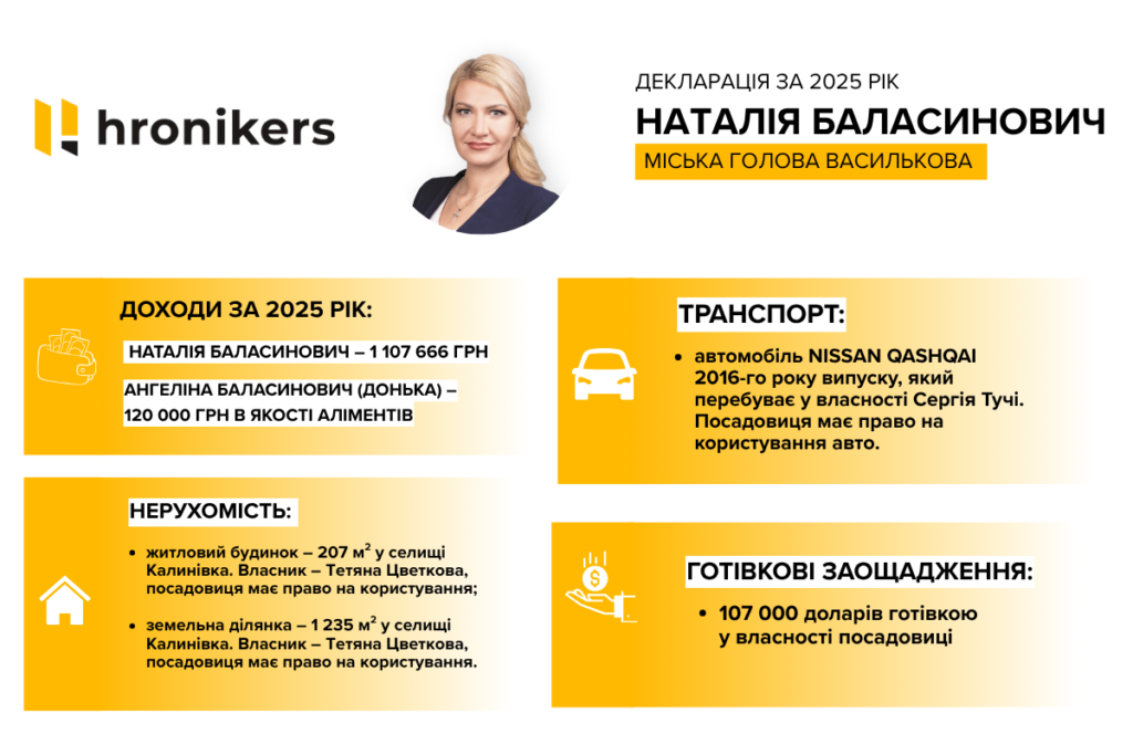 Міська голова Василькова Наталія Баласинович подала декларацію за 2025 рік. У документі зазначені її доходи, нерухомість та грошові активи.