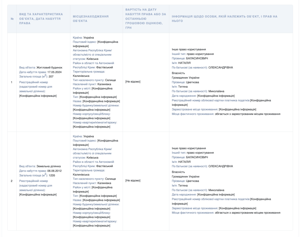 - земельна ділянка площею 1 235 м2 у селищі Калинівка на Київщині, власник – Тетяна Цветкова, посадовиця має право на користування землею.