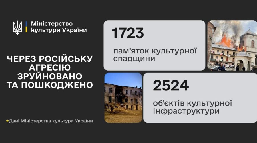 За даними міністерства, загалом станом на початок квітня 2026 року через російську агресію в Україні зруйновано та пошкоджено 1723 пам’ятки культурної спадщини та 2524 об’єкти культурної інфраструктури.