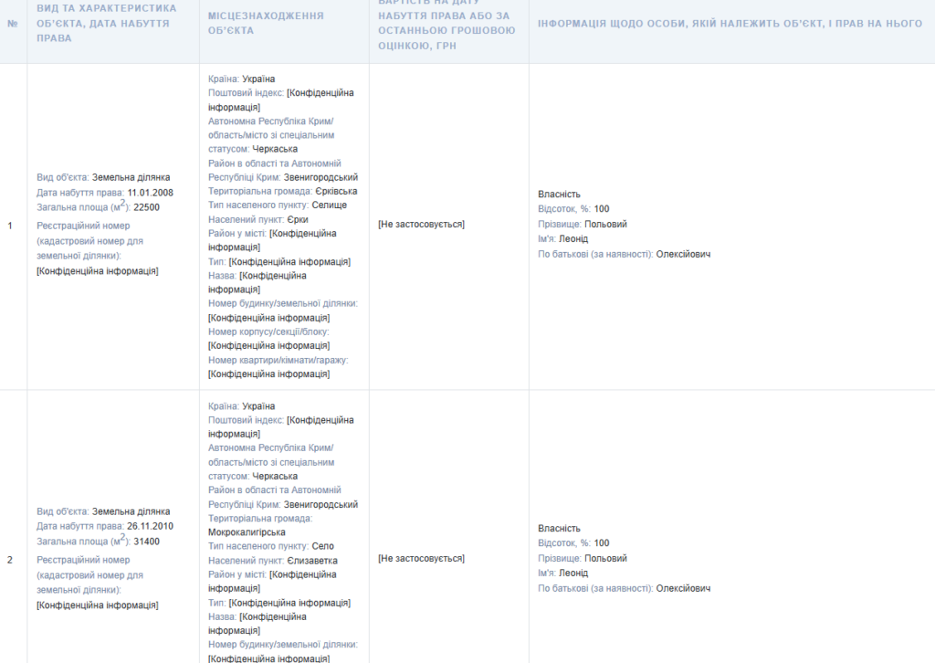У декларації зазначено чотири земельні ділянки.