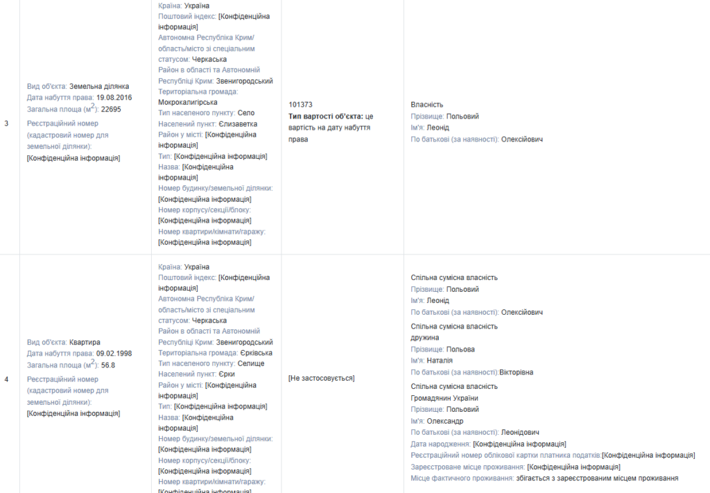 Також задекларовано квартиру площею 56,8 м² у селищі Єрки, набута 9 лютого 1998 року. Вона перебуває у спільній сумісній власності Леоніда Польового, його дружини Наталії та ще одного співвласника — Олександра Польового.
