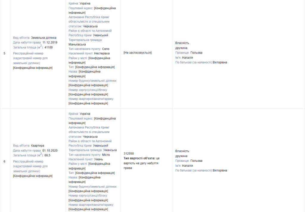 Окремо вказана квартира в місті Умань площею 66,5 м², яку дружина набула 1 жовтня 2020 року. Її вартість на дату набуття права — 312 550 грн.