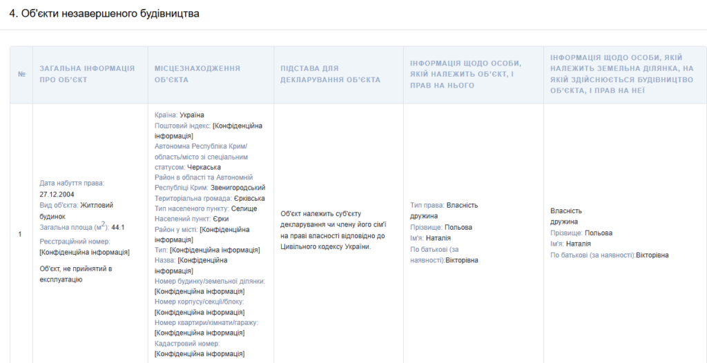 У розділі об’єктів незавершеного будівництва зазначений житловий будинок площею 44,1 м² у селищі Єрки. Право власності оформлене на дружину.