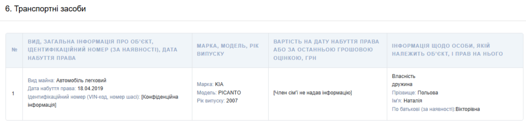 Із транспортних засобів у декларації вказаний легковий автомобіль KIA Picanto 2007 року випуску. Право власності з 18 квітня 2019 року належить дружині. Вартість авто не зазначена.
