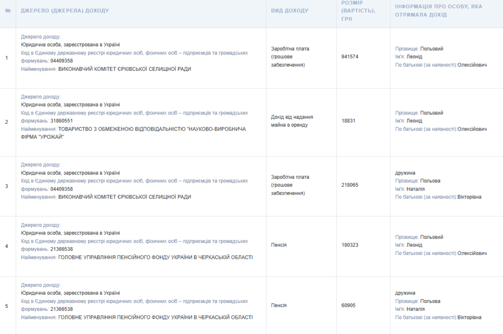 За 2025 рік Леонід Польовий отримав 941 574 грн заробітної плати у виконавчому комітеті Єрківської селищної ради та 180 323 грн пенсії. Додатково він задекларував 18 831 грн доходу від надання майна в оренду від ТОВ «Науково-виробнича фірма “Урожай”» і 16 383 грн — від фермерського господарства «Осієвська».
