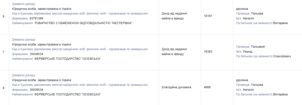 Дружина Наталія Польова отримала 218 065 грн заробітної плати у виконавчому комітеті Єрківської селищної ради, 60 905 грн пенсії, 18 181 грн доходу від оренди майна від ТОВ «Нестерівка» та 4 000 грн благодійної допомоги від фермерського господарства «Осієвська».