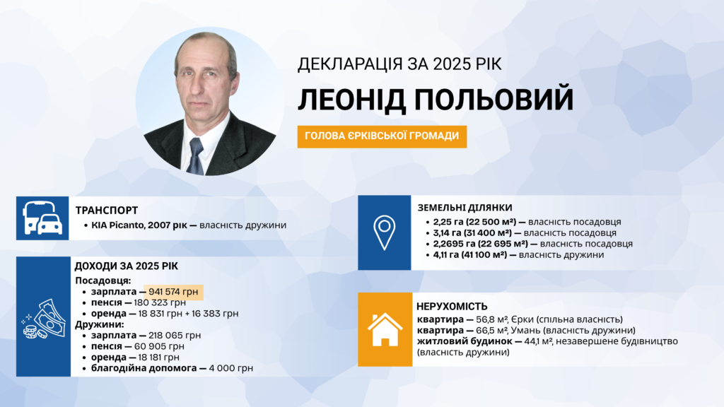 Селищний голова Єрківської територіальної громади Леонід Польовий подав декларацію за 2025 рік у березні 2026-го. У документі вказані земельні ділянки, квартири, автомобіль, об’єкт незавершеного будівництва та доходи родини.