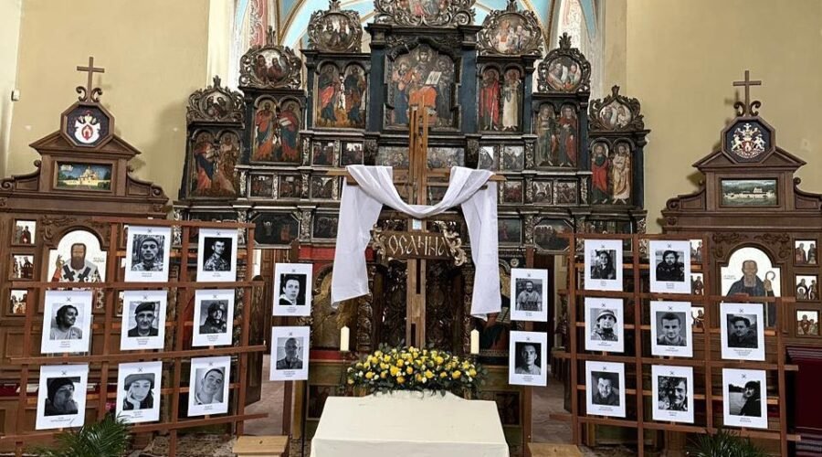 У Страсну п’ятницю, у львівській церкві Святого Климентія Шептицького встановили особливу інсталяцію Плащаниці. Замість квітів навколо Гробу — портрети загиблих військовослужбовців. Світлини інсталяції поширили на сторінці храму.