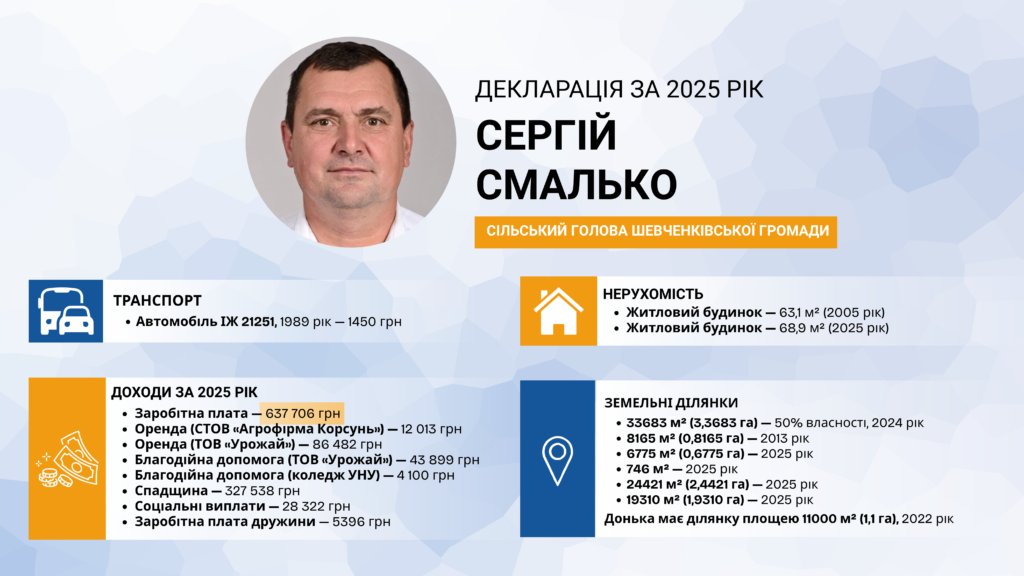 Сільський голова Шевченківської територіальної громади Сергій Смалько подав декларацію за 2025 рік. У документі вказані житлова нерухомість, земельні ділянки, транспорт і доходи родини. Основну частину доходу становить заробітна плата з бюджету.