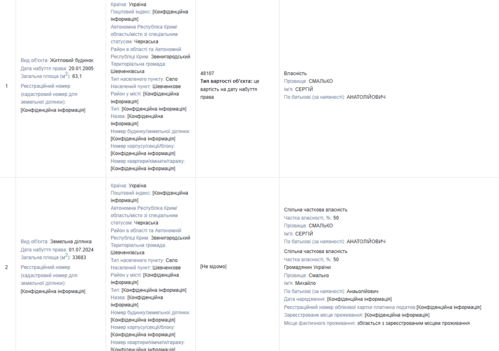 У власності Сергія Смалька — житловий будинок площею 63,1 м², набутий у 2005 році.