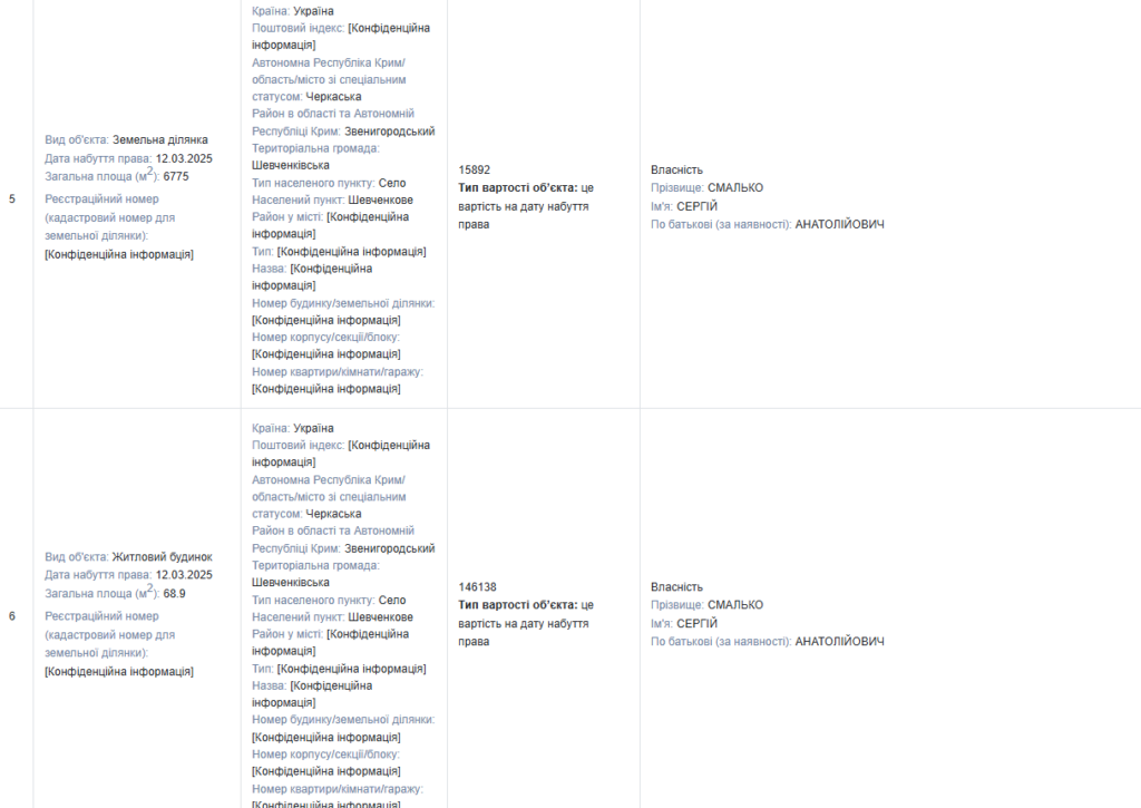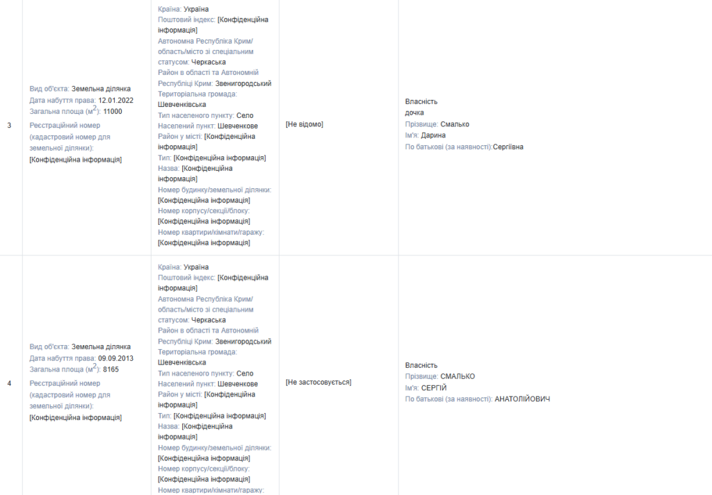 Донька посадовця Дарина Смалько володіє земельною ділянкою площею 11000 м² (1,1 га), набутою у 2022 році.