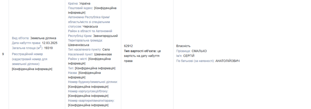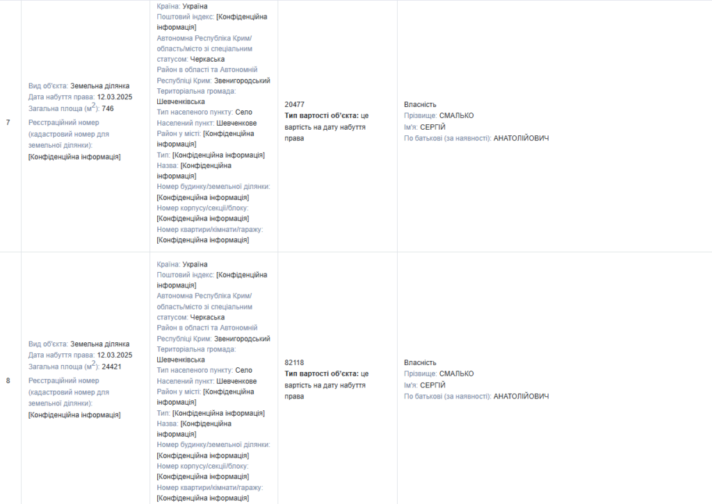 - 33 683 м² (3,3683 га) — у спільній частковій власності (50%) із Михайлом Смальком, набута у 2024 році;