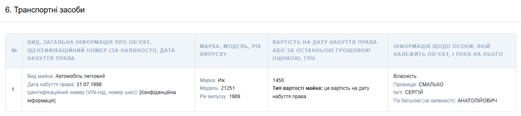 У декларації зазначений один транспортний засіб — легковий автомобіль ІЖ 21251 1989 року випуску. Його вартість на момент набуття права становила 1450 грн.