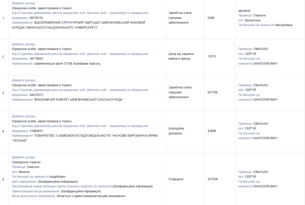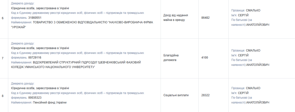 Основним джерелом доходу Сергія Смалька є заробітна плата у виконавчому комітеті Шевченківської сільської ради — 637 706 грн за рік.