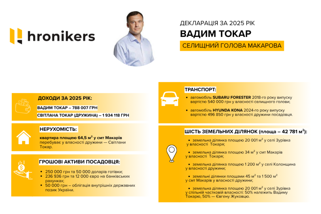 Селищний голова Макарова Вадим Токар подав декларацію за 2025 рік, де вказані доходи сім’ї, нерухомість, транспорт і грошові активи.