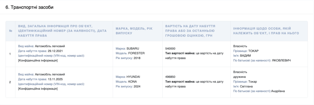 - SUBARU FORESTER 2018-го року випуску вартістю 540 000 грн у власності селищного голови;